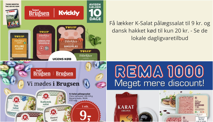 DagliBrugsen har et godt tilbud på K-Salat pålægssalat i varianterne tun salat, italiensk salat, kylling & baconsalat og hønsesalat. Du kan få 100-150 g til kun 9 kr. pr. stk. Tilbuddet gælder fra torsdag den 2. april til og med torsdag den 9. april.