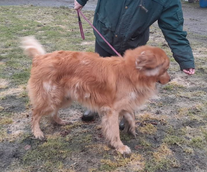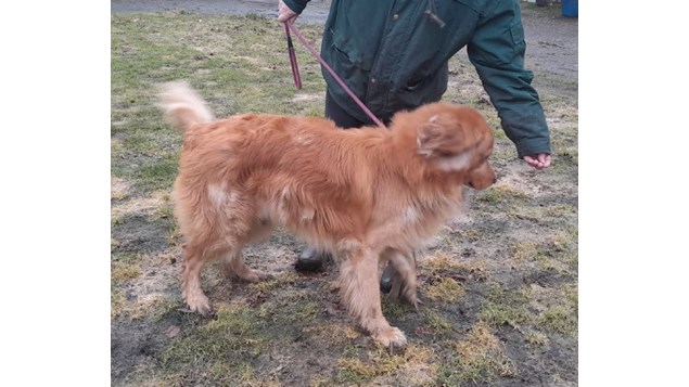 Hunden er gyldenbrun og ligner umiddelbart en krydsning mellem golden retriever og en anden ukendt større hunderace.