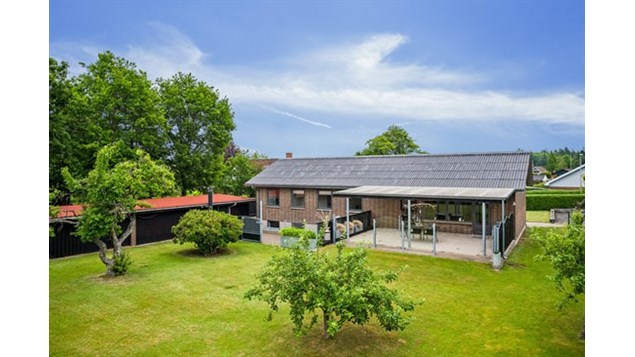 Udenfor kan du nyde en stor og frodig grund på 1.366 m² med god luft omkring boligen. Foran huset finder du en lukket, flisebelagt gårdhave – et hyggeligt og afskærmet uderum – samt gode parkeringsforhold på egen grund.