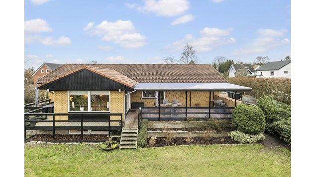 Villaen er opført i 1974 og byder på hele 164 kvadratmeter bolig i stueplan plus en fuld kælder på ligeledes 164 m2. Hele herligheden er placeret på en 958 m2 med nem, lukket have, der passer sig selv – næsten. Indkørsel med flere p-pladser samt garage på 29 m2. Ejendommen opvarmes via fjernvarme. Der er gulvvarme i badeværelse, toilet og entré.